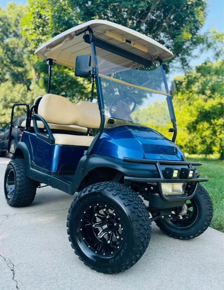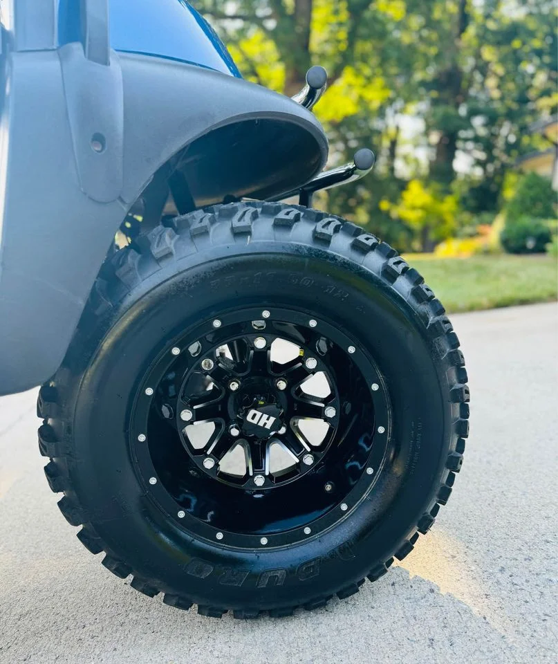 Featuring a 6-inch lift kit with a robust suspension upgrade including heavy-duty shock absorbers, this lifted golf cart offers increased ground clearance and improved handling on rough or uneven terrain. Wheels are upgraded to large 12-inch Storm Trooper wheels fitted with 22-inch all-terrain tires, providing excellent traction and a comfortable ride.