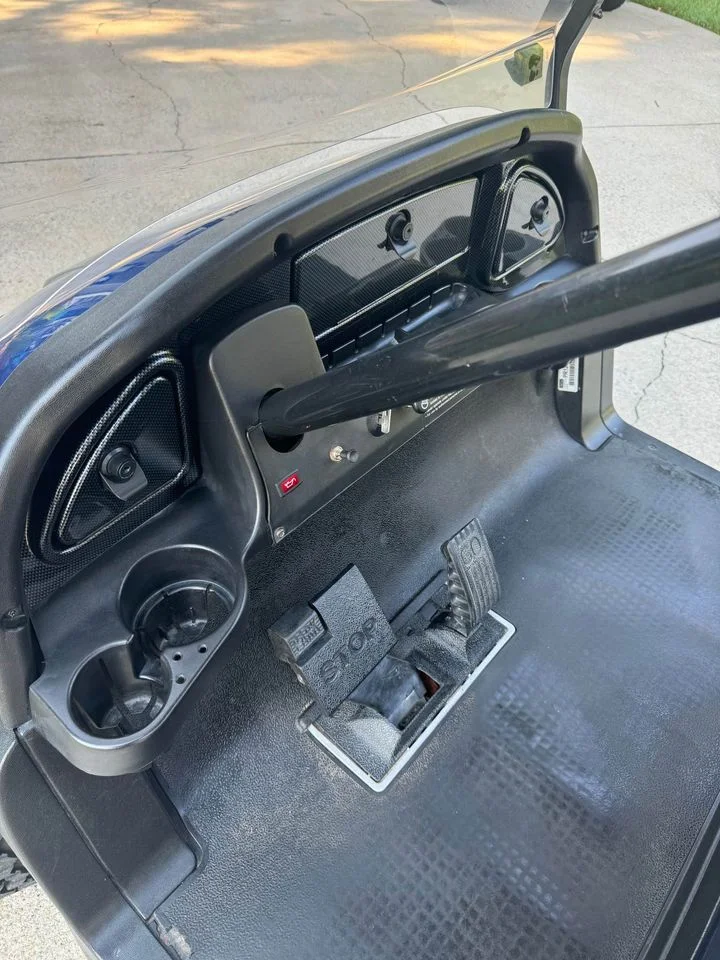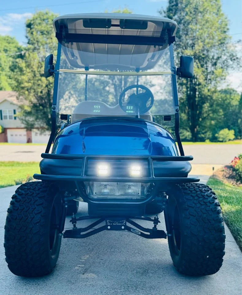 Additional features include LED headlights, taillights, turn signals, a horn, and fold-down tinted windshield to provide added convenience and safety. The golf cart includes dual mirrors and a 5-panel overhead golf cart mirror assembly for optimal visibility.