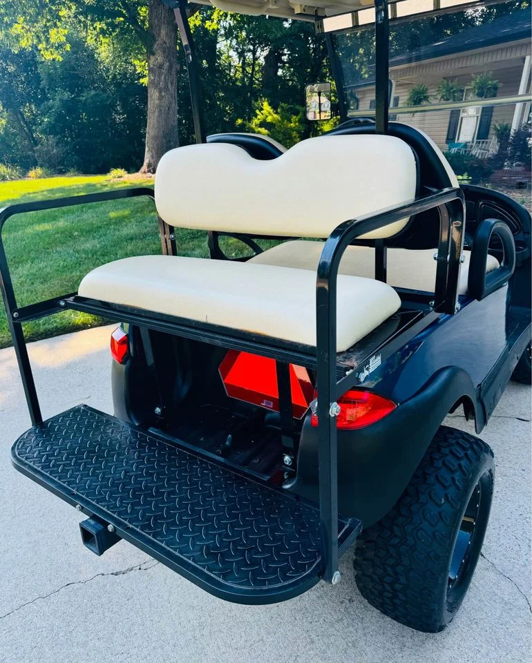The body boasts a factory-quality finish with powder-coated golf cart frame for corrosion resistance and durability, while seating offers comfortable, weather-resistant two-tone black and gray vinyl upholstery with an extended rear facing seat to accommodate four passengers or extra cargo space when folded.
