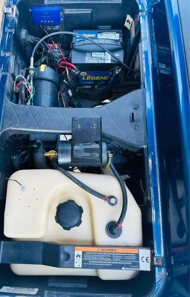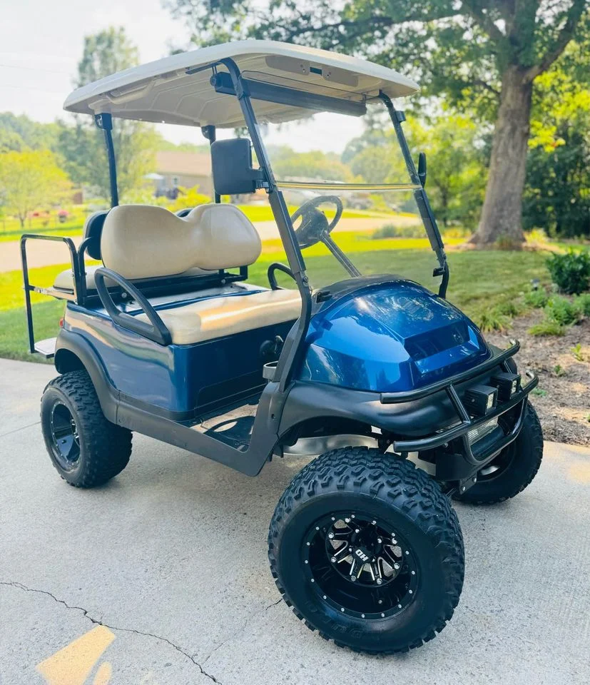 The 2012 Club Car Lifted Gas Golf Cart is a new, robust vehicle designed for enhanced performance, rugged terrain capability, and smooth handling. Powered by a 429 cc Kohler OHV engine with Electronic Fuel Injection (EFI), it delivers an impressive 14.0 horsepower rated at 3,600 RPM according to SAE J1940 standards. This golf cart achieves a top speed of approximately 17 mph (27 km/h), ideal for golf courses, neighborhoods, and light utility tasks.