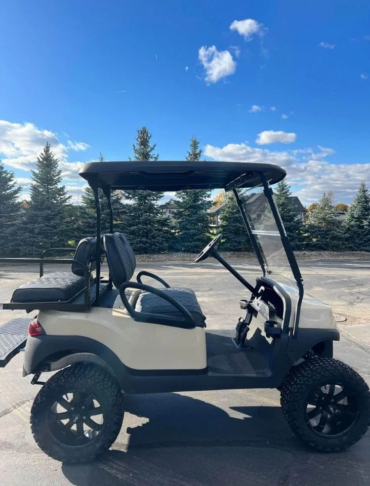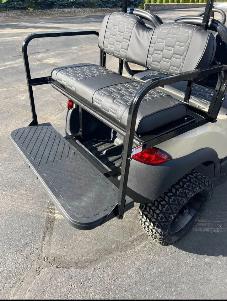 This 4-passenger golf cart boasts a durable aircraft-grade aluminum frame with ladder-style construction, ensuring long-lasting corrosion resistance and structural integrity. The self-compensating double reduction helical rack and pinion steering, along with independent leaf spring suspension and dual hydraulic shocks, delivers responsive handling and a comfortable ride. Its 6-gallon fuel tank supports extended use without frequent refueling.