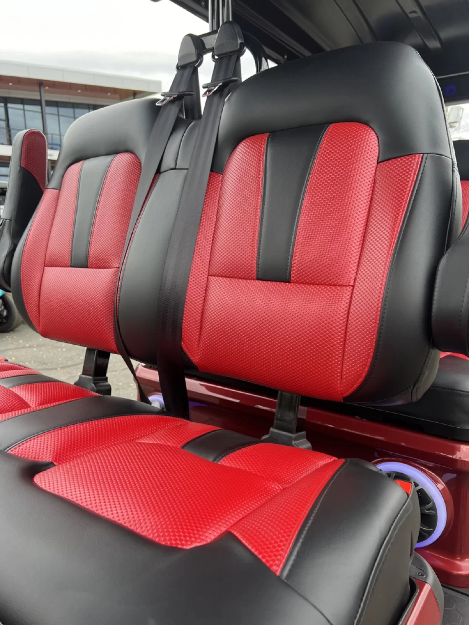 This golf car with six passengers has two colours of seats, with folding armrests and seat belts, making it the ideal vehicle for a larger group. The chassis is made of powder coated steel with automotive quality, with a lifelong guarantee and is combined with an independent suspension for excellent driving comfort and stability. The wheels are made up of 1 x 7 inch aluminum rims with silent 23 x 10 – 1 off-road tires, providing excellent traction and smooth journey.