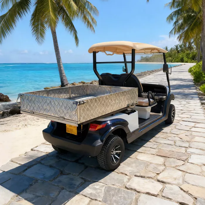 EnglishThis electric golf cart with a heavy-duty cargo utility bed is designed for efficiency and versatility. Powered by a high-performance electric motor, it delivers smooth, quiet rides with zero emissions, making it environmentally friendly and neighbor-friendly. The rugged cargo bed offers ample space for hauling tools, equipment, produce, or recreational gear, while integrated tie-down points secure your load. With a dependable battery system, you’ll enjoy consistent performance and extended range on a single charge. Ergonomic seating, easy-to-use controls, and low maintenance requirements make it perfect for property maintenance, hospitality, industrial use, or personal transportation. Whether you’re running errands, transporting goods, or exploring your property, this electric golf cart combines practicality and comfort in one reliable package.